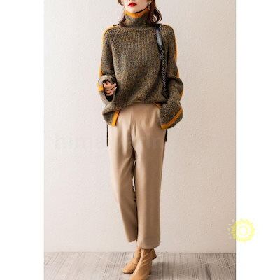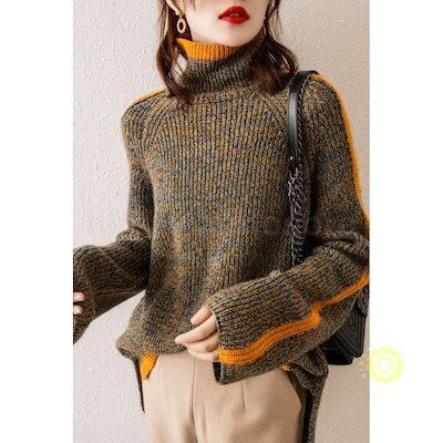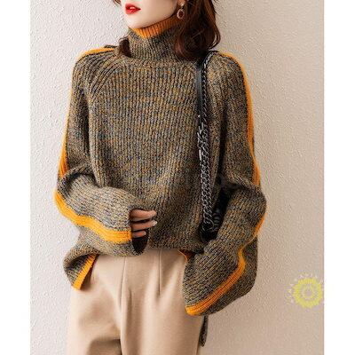 ニットセーター レディース 秋冬 40代 長袖トップス 配色セーター ハイネック ニットインナー 丈 プルオーバー ゆったり 韓国風 オシャレ カジュアル