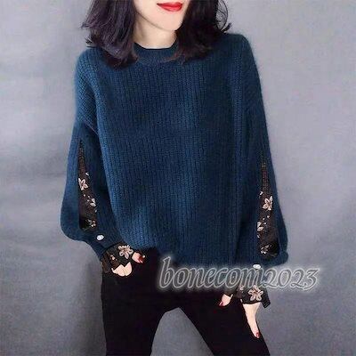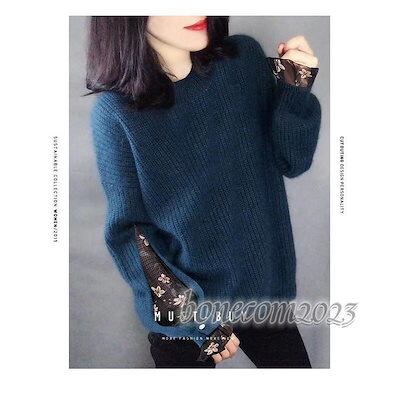 ニットトップス レディース 秋冬30代長袖トップス 無地ニットトップス 花柄シフォン切り替え プルオーバー ゆったりセーター 韓国風 大人可愛い オシャレ