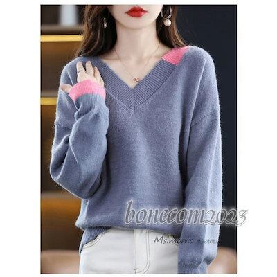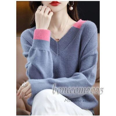 ニットトップス レディース 秋冬30代長袖セーター 配色 Vネック 丈セーター ゆったりプルオーバー オシャレ韓国風 大人ニットインナー