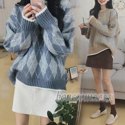 ニットセーター レディース秋冬 セーター 丸首 トップス 長袖 ニットソー チェック柄セーター 韓国風 学生ニット ゆったり セーター30代/50代