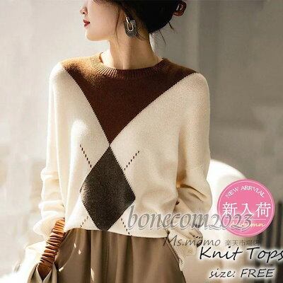 ニットトップス レディース 秋冬30代長袖セーター 配色 ひし形 丈セーター ゆったりプルオーバー オシャレ韓国風 大人ニットインナー