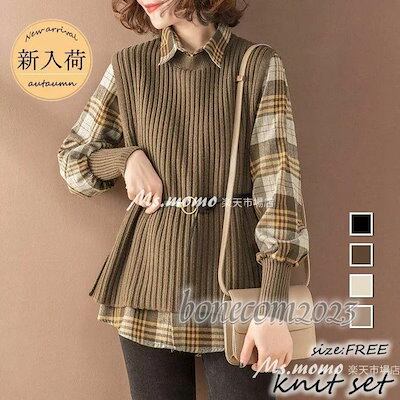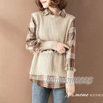 ニットトップス レディース 秋冬30代長袖セーター ニットセットアップ ニットベスト チェック柄ブラウス ゆったり オシャレ韓国風 大人 通勤 着痩せ50代30代
