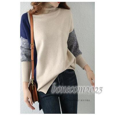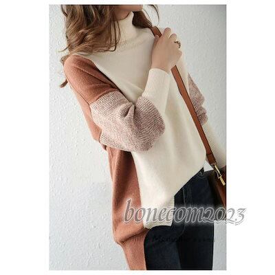 ニットトップス レディース 秋冬30代長袖セーター ハイネック 丈セーター 配色 ゆったりプルオーバー オシャレ韓国風 大人ニットインナー 厚手