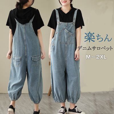 デニムサロペット ビングシルエット オーバオール ロング丈 ボトムス バルーンパンツ オールインワン レディース サルエル サロペット ゆったり デニム 無地 大きいサイズ トップス ワイドパンツ