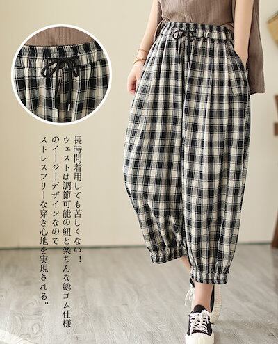 薄手 ゆったり 春夏 九分丈 アンクルパンツ 部屋着 リネン チェック レディース イージーパンツ テーパード ウェスト紐 チェックパンツ パンツ 可愛い ギンガムチェック 総ゴム ポケットサルエルパ