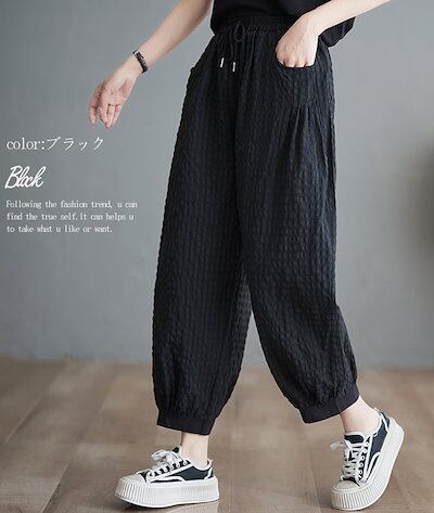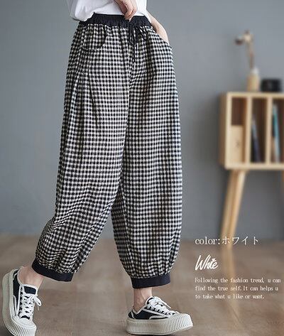 着痩せ 配色 バルーンパンツ 春夏 コットンリネン 大きいサイズ 総ゴム ロング サルエルパンツ ストレスフリー 丸いシルエット ギャザー パンツ レディース チェックパンツ ポケット ワイド イージ