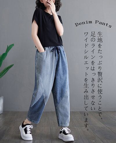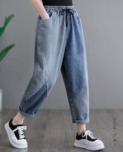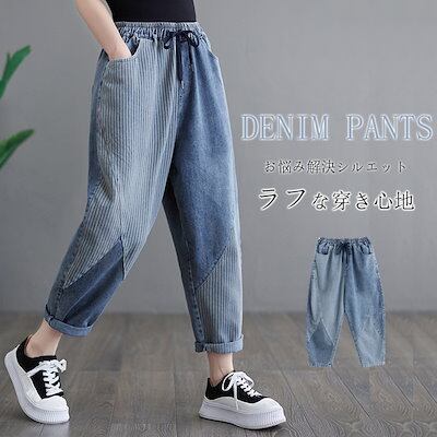 オシャレ デニムパンツ ハイウェスト ゆったり 体型カバー テーパードパンツ ウェストゴム バルーンパンツ ストライプ 秋 紐付き キレイメ 個性的 大きいサイズ サイドポケット レディース 春 夏