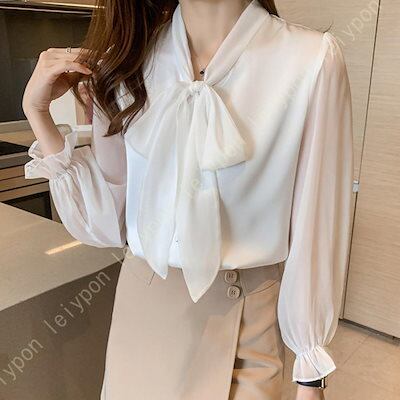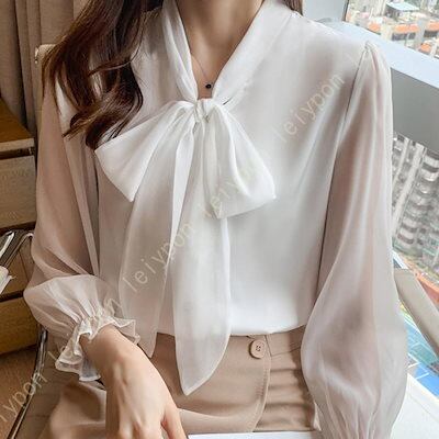 シフォン リボン付き 九分袖 ブラウス リボンタイ ボウタイ レディース 白 フォーマル スーツ 演奏会 入学式 ママ スーツ インナー ブラウス おしゃれ 可愛