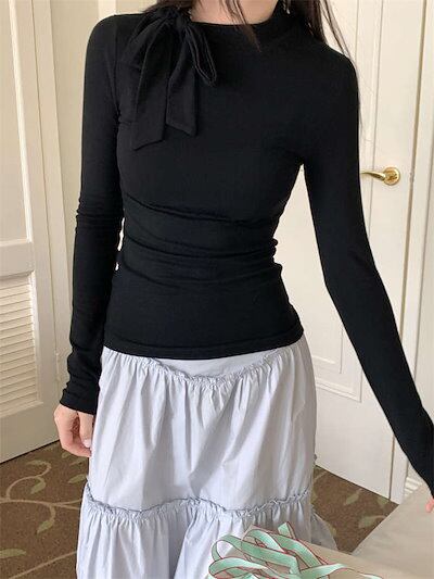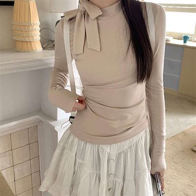 カットソー レディース Tシャツ ボウタイ 首元リボン トップス ハイネック 薄手 オフィス プルオーバー インナー ストレッチ スーツインナー 春 秋 夏 冬 かわいい フォーマル カジュアル 高品