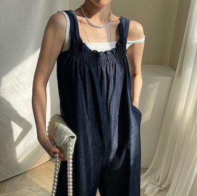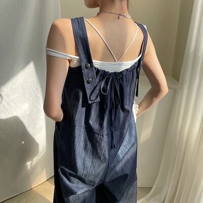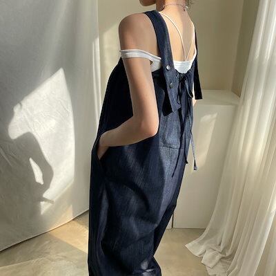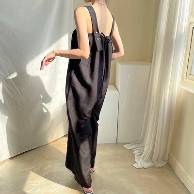 サロペット オーバーオール ロング丈 レディース 個性的 無地 ノースリーブ バックリボン かわいい おしゃれ こなれ感 ラフ 楽ちん 休日 おでかけ メンズライク ボーイッシュ フリーサイズ