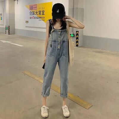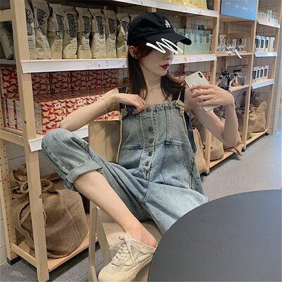 可愛く体型カバー デニムパンツ オーバーオール ワイドパンツ レディース ジーンズ オールインワン