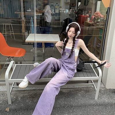 レトロ パープル オーバーオール デニムオーバーオール レディース 春 新作 ゆったり ワイドパンツ ハイウエスト サロペット