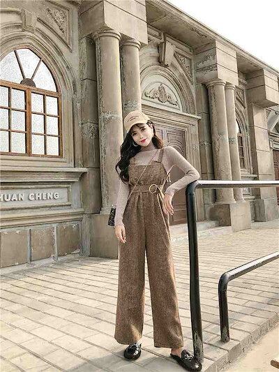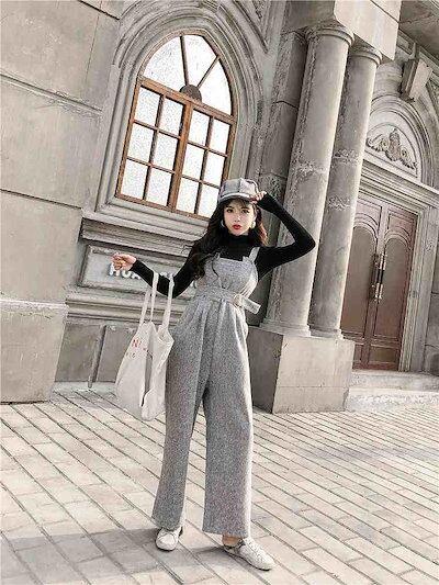 レディース 2点セット サロペット ニット 長袖 オールインワン オーバーオール ボトムス カジュアル 可愛い フェミニン おしゃれ お出かけ デイリー 普段着 秋 冬 ブラウン グレー 茶 灰色