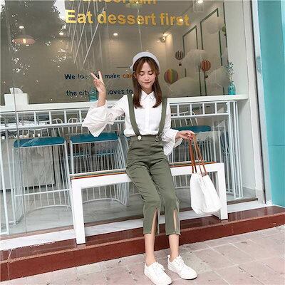 レディース セットアップ 7分袖シャツ 袖フリル ボトムス サロペット オーバーオール クロップドパンツ 無地 フリーサイズ カジュアル 大人可愛い デイリー お出かけ デート カーキ