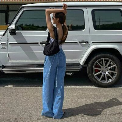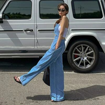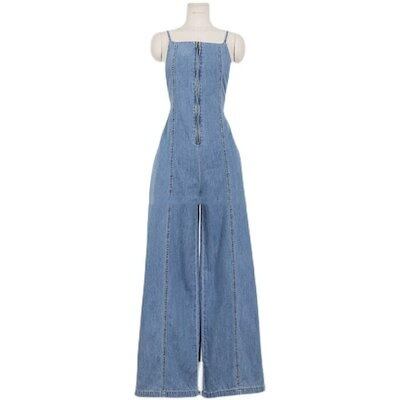 サロペット デニム オーバーオール パンツ レディース きれいめ カジュアル ロング丈 大人 可愛い ノースリーブ フェミニン かっこいい 体型カバー 韓国 シンプル フロントジップ 青 ブルーオール