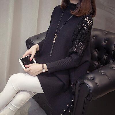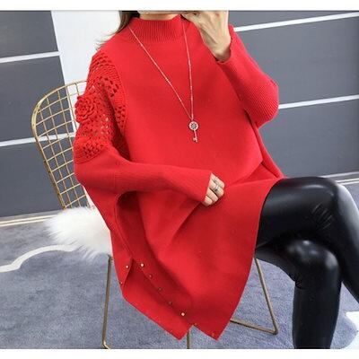 ニットセーター ニットソー レディース トップス プルオーバー ハイネック シンプル 刺繍 カジュアル オフィス タイト 伸縮性 体型カバー ベーシック-424