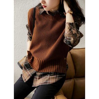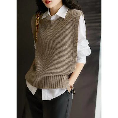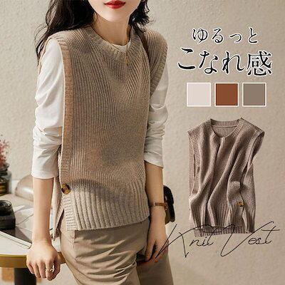 ニットベストレディースクルーネックプルオーバーチョッキ重ね着着痩せノースリーブレイヤードカジュアルコーデ細身サイドボタン