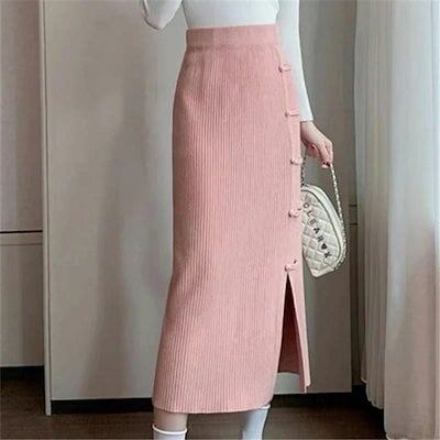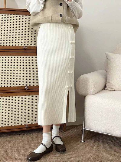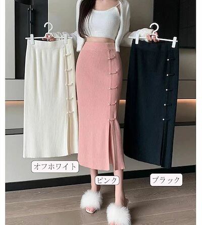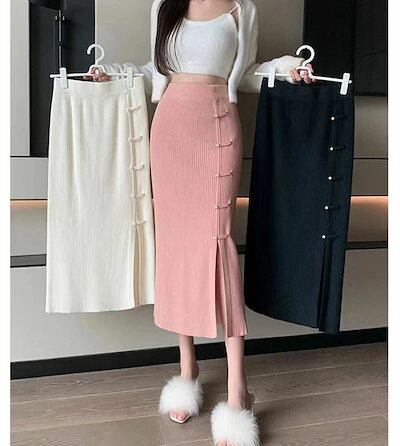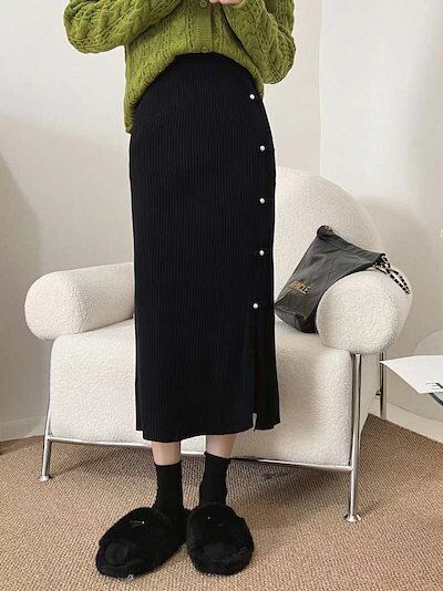 タイトスカートレディース秋冬ニットスカートロングスカート無地ニットタイト膝丈スカート無地タイトスカートバックスリット秋冬タイトボタン飾るペンシルスカートミモレ丈レト