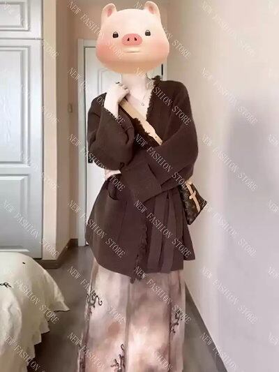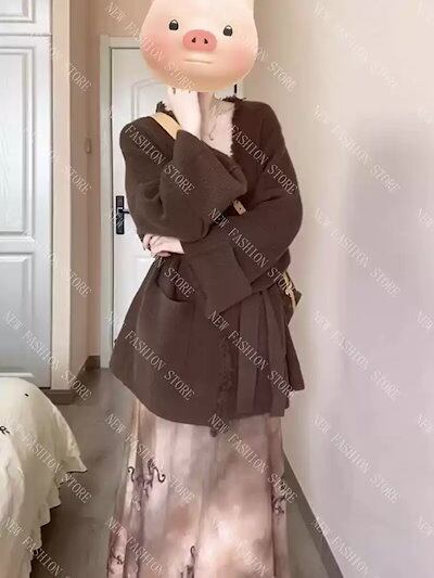 カレー色Vネックフリンジセーターカーディガンレディース秋冬韓系ニットコート-77