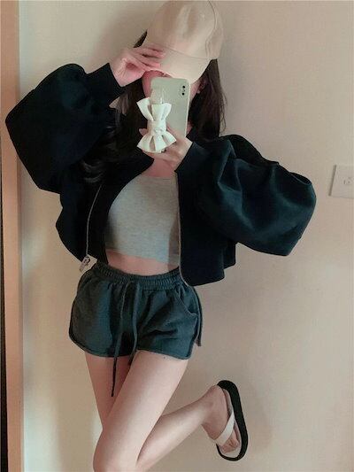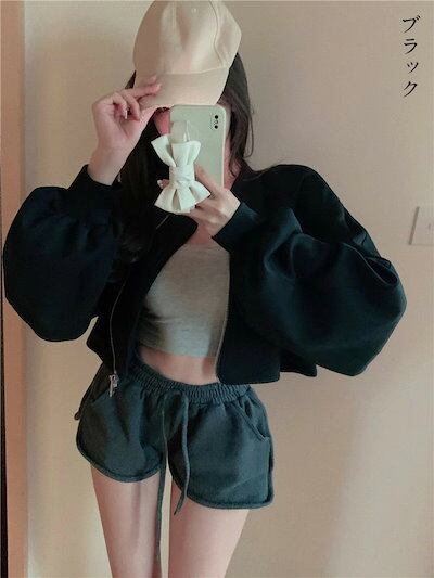 ノーカラー パフスリーブ ショート ジャケット ジップアップ シンプル 無地 カジュアル きれいめ 秋冬 おすすめ レディース オシャレ トレンド 人気 プチプラ 韓国ファッション