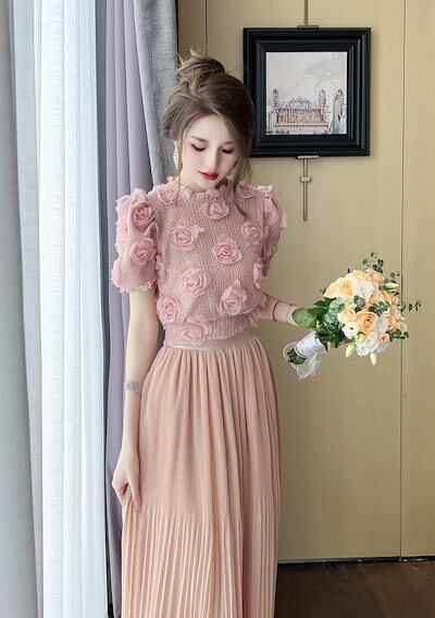 【JY.上品】 半袖 ニット花飾り 春夏 薔薇 フリル ショート丈 セーター レディース トップス ドレス パーティー キャバ 着痩せ 大人 お呼ばれ 同窓会 披露宴 卒業式 結婚式 ウェディング 二