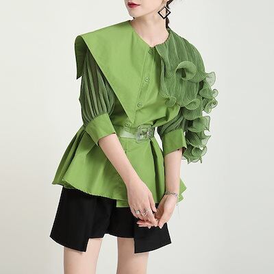【J.Fashion】 フリルブラウス 「短/長2タイプ」 おしゃれ チュニック 2way ドッキング レディース シャツ ベルト付き半袖 体型カバー レース 日焼け止め 韓国 ロンT メガ割