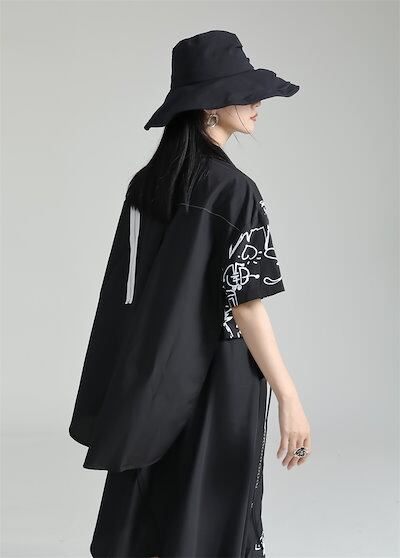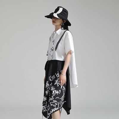 【J.Fashion】 前短後長 柄ブラウス 体型カバー レディースブラック シャツ 半袖 おしゃれ トップス 関連商品は店で購入可能 メガ割