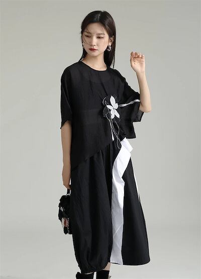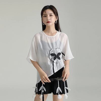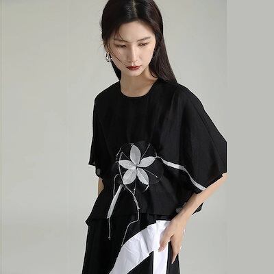 【J.Fashion】 花飾り 不規則 半袖 Tシャツ 薄手 夏 レディース おしゃれ 上質 関連商品は店で購入可能 メガ割