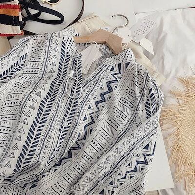 エスニック コットンシャツ レディース ロングシャツ 綿 トップス リネン シャツ 五分袖 ブラウス ナチュラル 着痩せ ゆったり 体型カバー カジュアル 可愛い Vネック 春 夏 秋