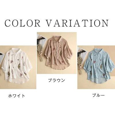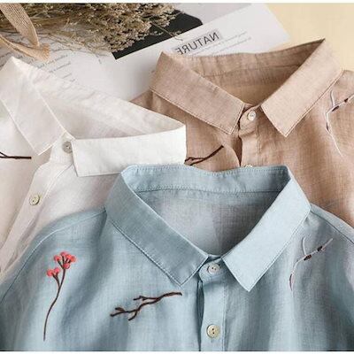 シャツ レディース シャツブラウス 春夏秋 コットン 7分袖 半袖シャツ 柄シャツ トップス 7分袖トップス 刺繍 花刺繍 綿 春 夏 秋
