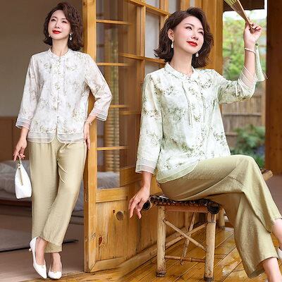 ルームウェア セットアップ スーツ 半袖 セットアップ 夏の薄手カジュアルママスーツ女新中式七分袖トップスパンツ2点セット スウェット上下セット レディース