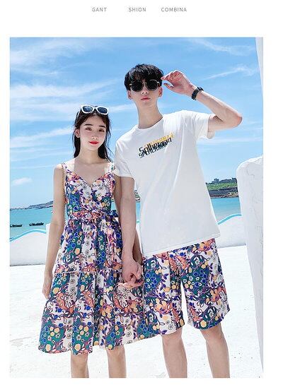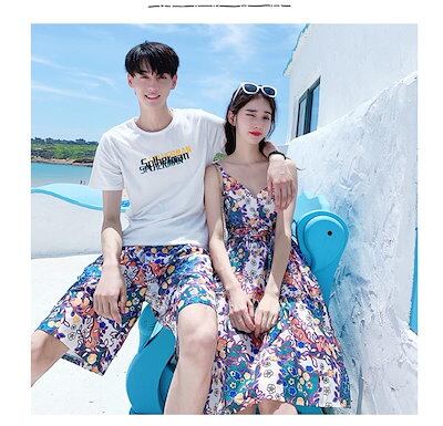 夏ワンピース ペアルック 上下セット カップル お揃い服Tシャツ上下セット トップス 半袖 レディース 水着 体型カバー メンス ハーフパンツ ビーチ 夏ワンピース シャツ 夏恋人 プレゼント ご夫婦