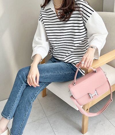 バルーン袖プルオーバーボーダー切替え襟付きスキッパーカットソー五分袖七分袖トップスボリューム袖ゆったり大きめ無地可愛いレディース韓国ファッション