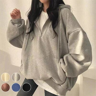 2024年春新作長袖 ハーフジップ裏起毛パーカー ボリュームスリーブ レディーストップス スウェット 無地 韓国ファッション