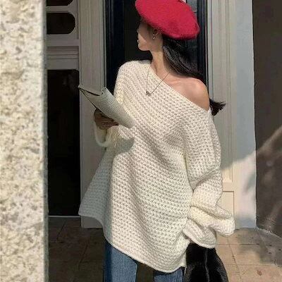 人気なリブニット Tシャツカットソー オフショルダーデザイン セーター レディース ゆったり 怠惰な風 百掛け ニットカーディガン 韓国ファッション トップス