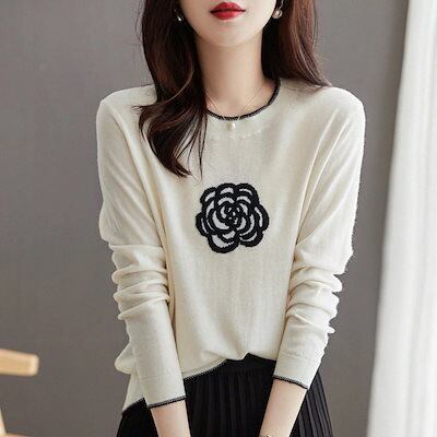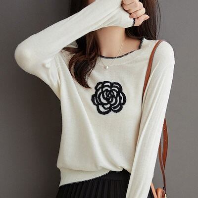 24新作梳毛レディースルーズラウンドネックプルオーバー長袖トップス ショート刺繍カメリア薄手ニットジャンパーボトムシャツロンT ベーシックニット