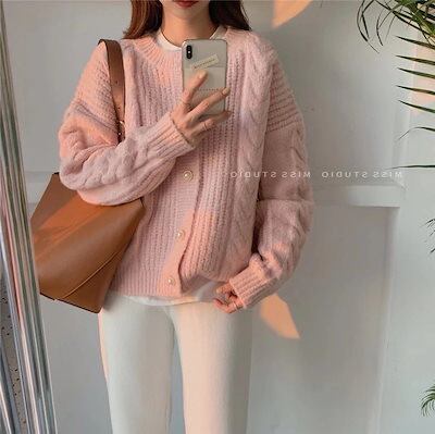 ピンク 無地 ツイストエイト セーター レディース コート 新作 ルーズ ソフト ワックス気質 ニット カーディガン 婦人服