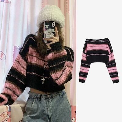 ギャルトップス ピンクニットセーターレディース 新作 ストライプ ゆったり デザイン長袖ファッション