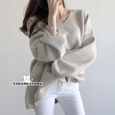 ニット レディース トップス 長袖 セーター Vネック ニットソー プルオーバー カジュアル ゆったり リブ オフィス シンプル インナー 重ね