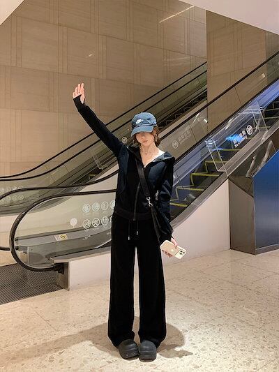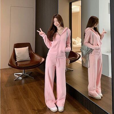 2024 秋冬 韓国 かわいいレディー 無地 フード付き長袖アウターレトロセット黑白フーディーブルサイズ丈トップス春カジュアルスポーツファッション系通学学生袖お出かけアップシルエットトラック羽織り上下
