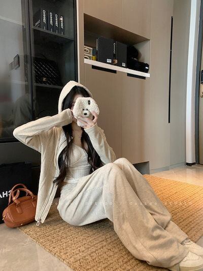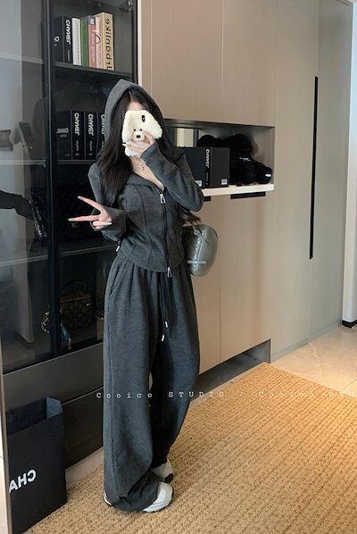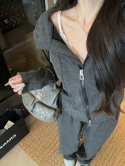2024 秋冬 韓国 かわいい レディース 無地フード付き長袖アウターレトロセット黑白フーディーダブルサイズ丈トップス春カジュアルスポーツファッション系通学学生袖お出かけアップシルエットトラック羽織り