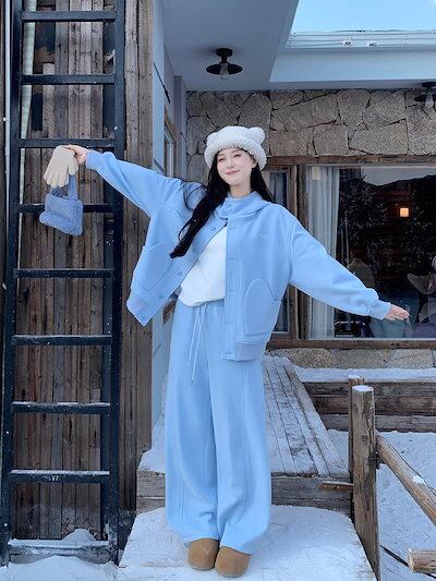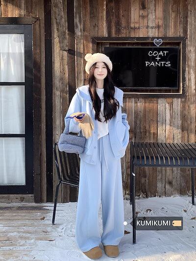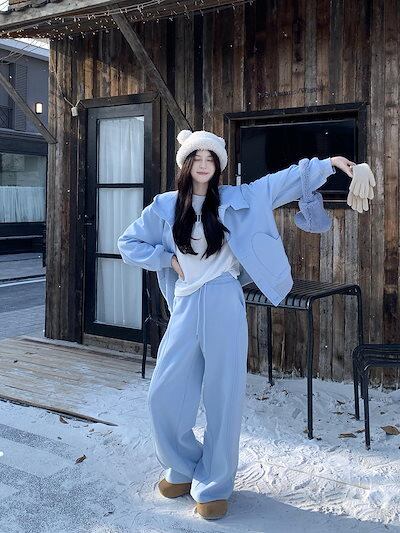 2024 秋冬 韓国 かわいい レディース 無地 ハイネック長袖アウターレトロセット黑白フーディーブルサイズ丈トップス春カジュアルスポーツファッション系通学学生袖お出かけアップシルエットトラック