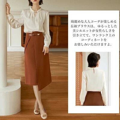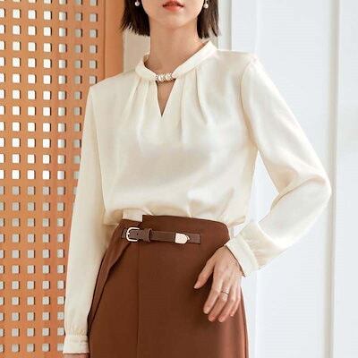 レディース シャツ トップス パールチェーン シフォン 秋 春 夏 ブラウス カジュアル シンプル オフィス パール 長袖 Vネック 大人 フォーマル ホワイト エレガント 入学式 卒業式 OL