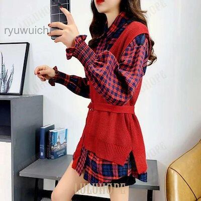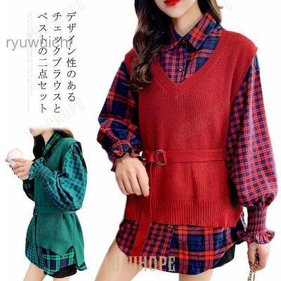 2点セット シャツブラウス レディース ニットベスト 重ね着 レイヤード チェック柄ブラウス とろみシャツ 長袖 チェックシャツ ドルマンシャツ ボリュームスリー