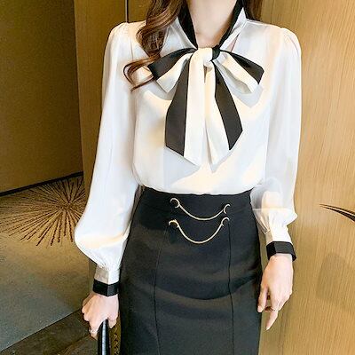 レディースシャツ 長袖 秋新作 蝶結び OLシャツ シフォンのシャツ 百掛け やせて見える 韓国ファッション