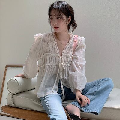 2024 秋冬トップス シャツ 長袖 Vネック 薄手 ゆったり リボン 秋 白 ホワイト おしゃれ かわいい ガーリー キュート 甘め 韓国ファッション レディース お出かけ