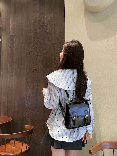 2024 秋冬トップス シャツ 長袖 ストライプ ボタン 襟 ピューリタンカラー セーラー襟 リボン 秋 青 ブルー おしゃれ かわいい 韓国ファッション レディース お出かけ