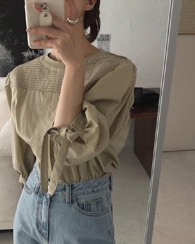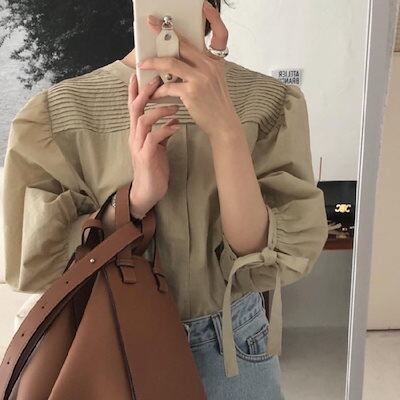 2024秋冬トップス シャツ リボン ラウンドネック プリーツ 長袖 ゆったり 秋 白 茶色 おしゃれ かわいい ガーリー キュート 甘め 韓国ファッション レディース お出かけ