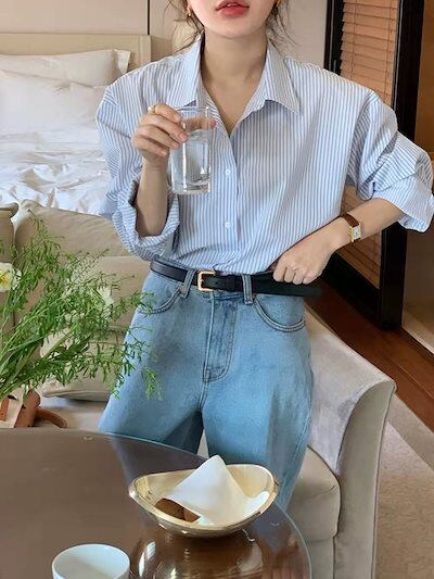 2024秋冬トップス シャツ 襟 スタンダードカラー ストライプ ボタン 長袖 ゆったり 秋 白 青 水色 おしゃれ かわいい 韓国ファッション レディース お出かけ