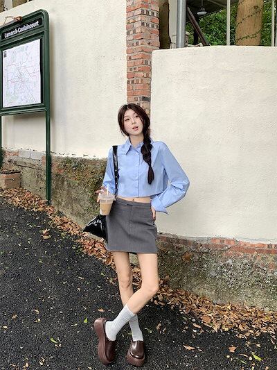 2024夏トップス シャツ 長袖 ボタン 襟 スタンダードカラー 丈短め 細見え 夏 ブルー 青 おしゃれ かわいい 韓国ファッション レディース お出かけ